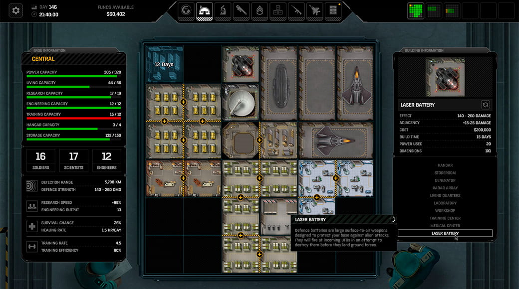 Небольшая радиолокационная станция на Аляске засекает аномалию в районе Берингова пролива. С баз ВВС на Камчатке и Юконе на перехват взлетают истребители, которые сбивают неопознанные объекты. В нескольких тысячах километров отсюда инженеры РЭБ из Италии вместе с коллегами из Алжира и истребителями, базирующимися во Франции, обнаруживают активность пришельцев на Иберийском полуострове. В это время ваши специалисты возводят новую базу в Юго-Восточной Азии, где инопланетяне уже несколько раз проникали через бреши в обороне и сеяли панику среди мирного населения. Проектируйте и возводите военные базы по всему миру, оснащайте их перехватчиками и воздушным транспортом, дальними радарами и поисковыми отрядами. Не забывайте, что запас топлива у транспорта ограничен, а значит, ваши базы должны покрывать весь земной шар без серьезных пробелов: только так вы сможете сдержать инопланетное вторжение. У каждой базы может быть своя задача: какие-то засекают врага, на других базируются перехватчики, третьи служат казармами для ваших боевых отрядов.